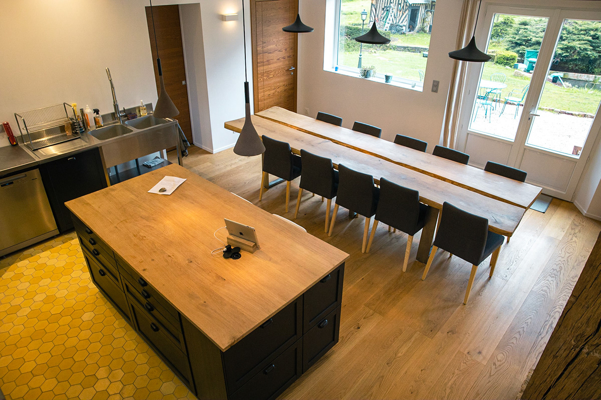 Aménagé à l’intérieur d’une bâtisse à colombages typiquement normande, le shala, salle de pratique de 70m2, est équipé de tapis, blocs et sangles pour 18 personnes. De jolies ajourements entre les colombages pour profiter de la lumière naturelle.